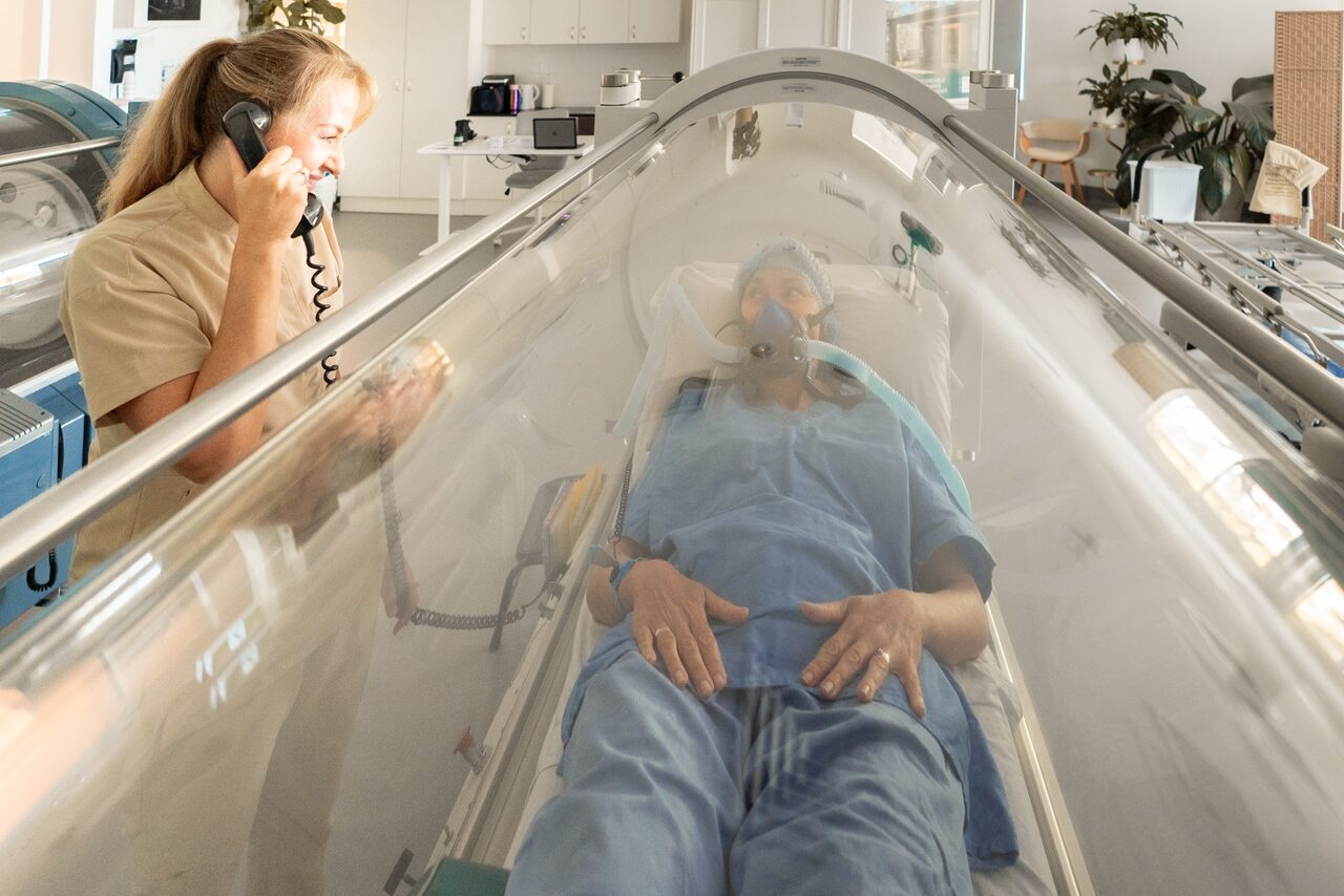 Hyperbaric Oxygen Therapy (HBOT) is a treatment used to increase the amount of oxygen reaching the bodies’ cells. It is administered by a patient spending time in a hyperbaric chamber and breathing pure oxygen (pressure above sea level 1 atmospheric pressure) the same sort of chamber as used to treat scuba divers suffering from the benz.